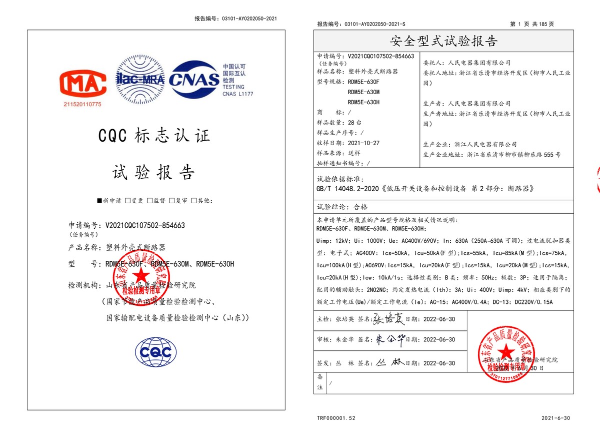 CQC試驗報告(202206):RDM5E-630M,RDM5E-630F,RDM5E-630H塑料外殼式斷路器(點擊下載)