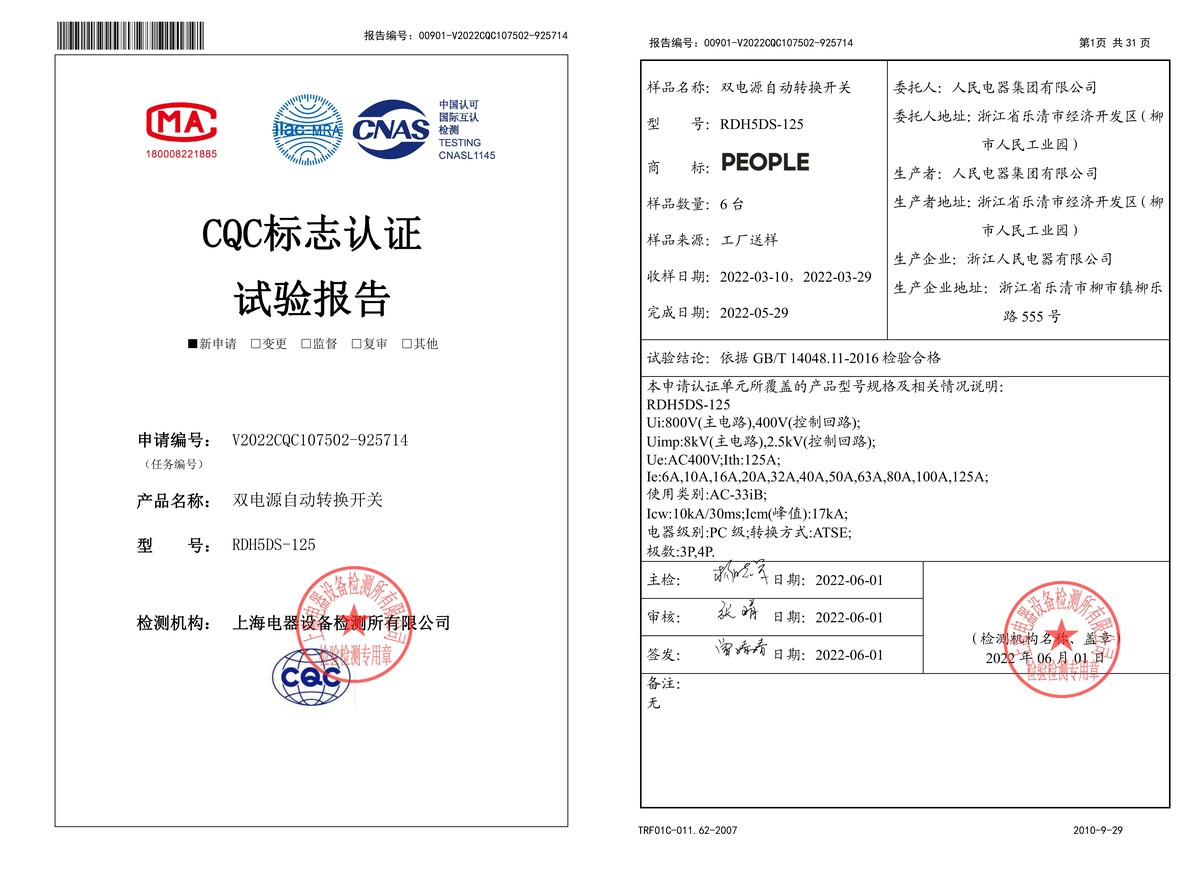 CQC試驗報告(202206):RDH5DS-125雙電源自動轉(zhuǎn)換開關(guān)(點擊下載)