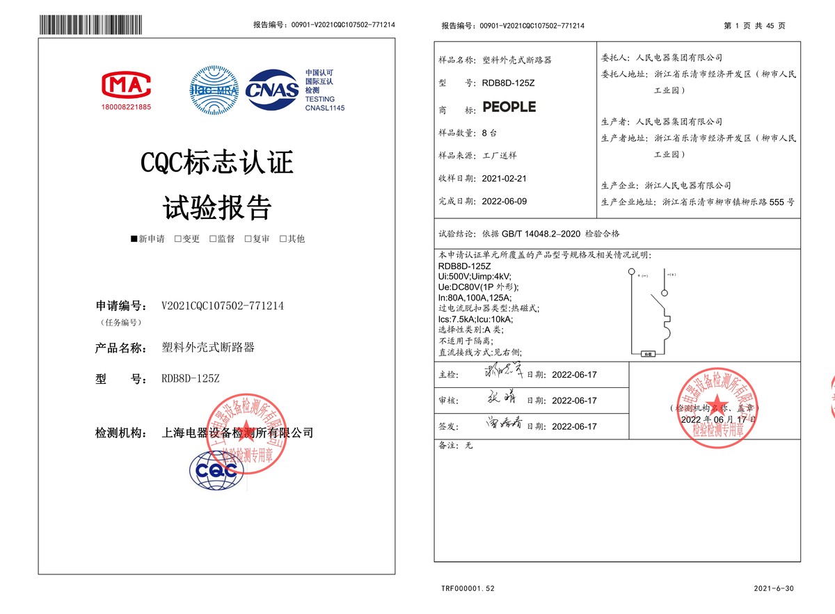 CQC試驗報告(202206):RDB8D-125Z塑料外殼式斷路器(點擊下載)