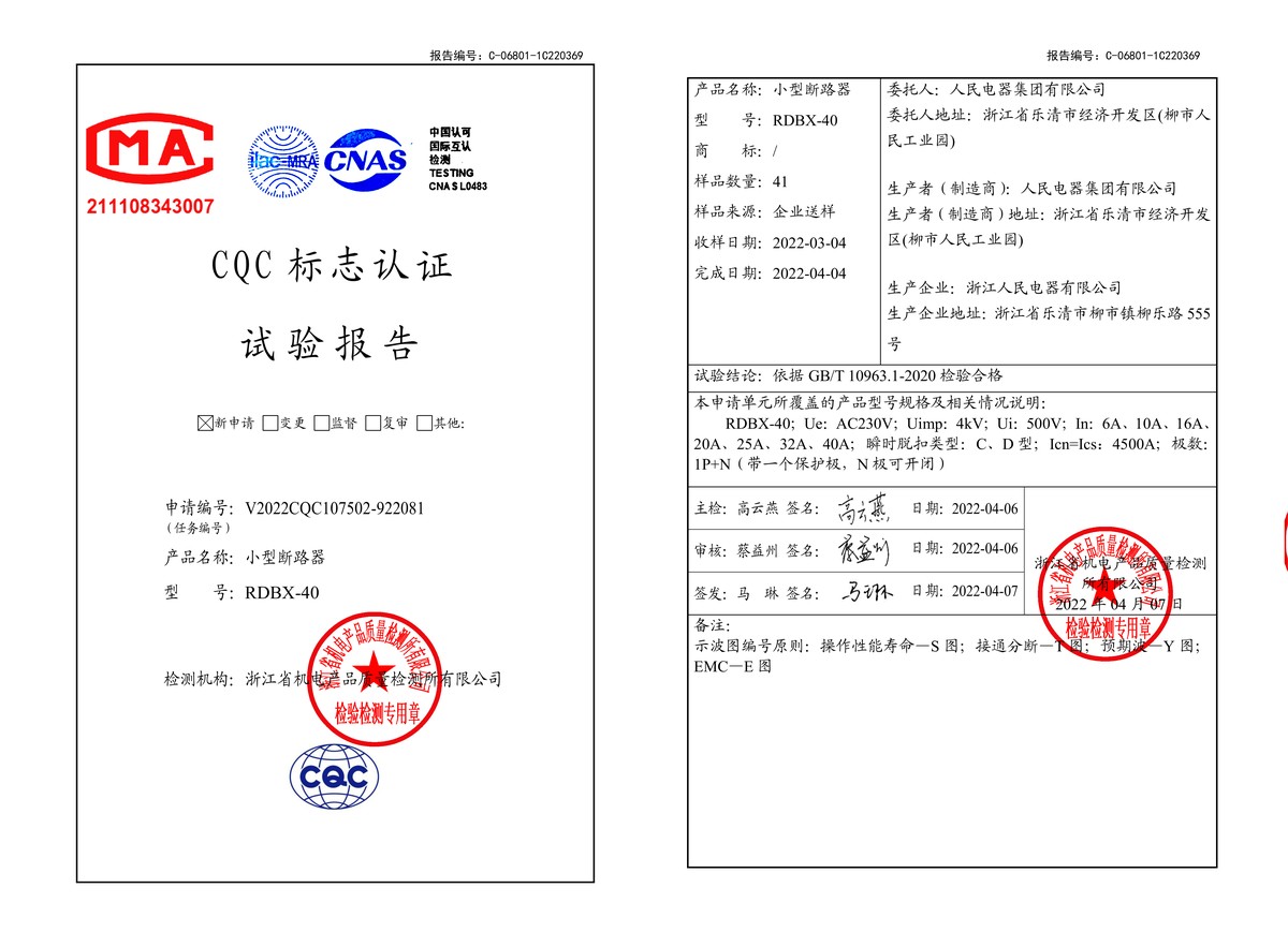 CQC試驗報告(202204):RDBX-40小型斷路器(點擊下載)