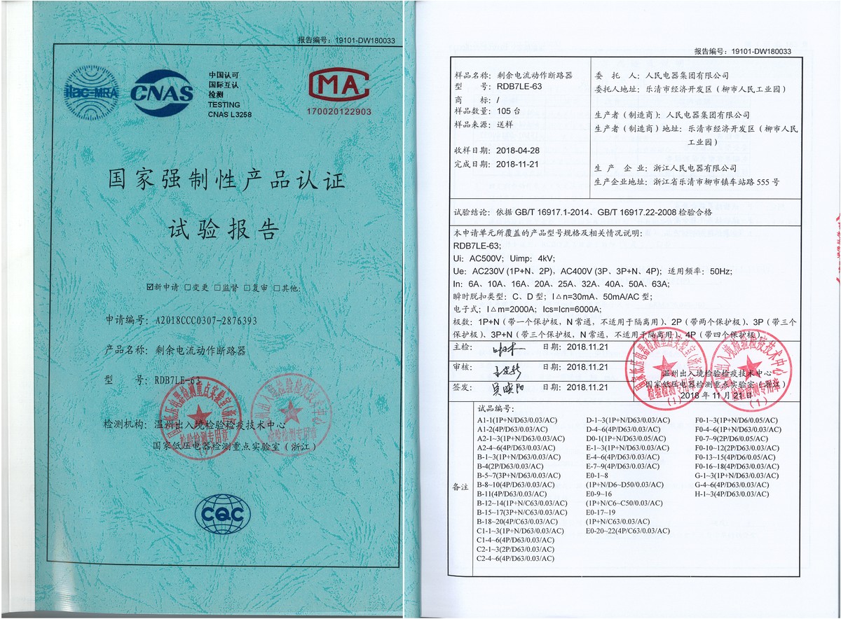 CCC試驗報告(201811):RDB7LE-63剩余電流動作斷路器(點擊下載)