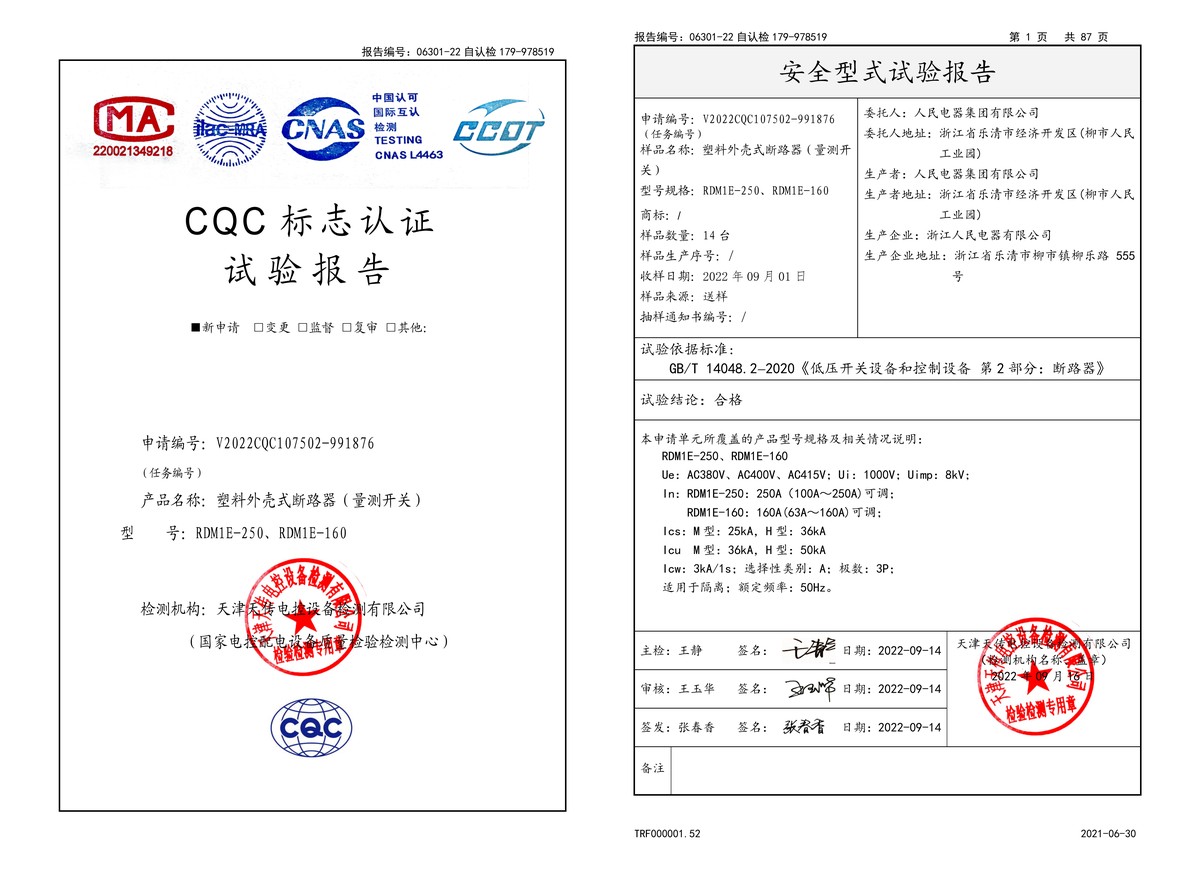 CQC試驗報告(202209):RDM1E-160,RDM1E-250塑料外殼式斷路器(量測開關(guān))(點(diǎn)擊下載)