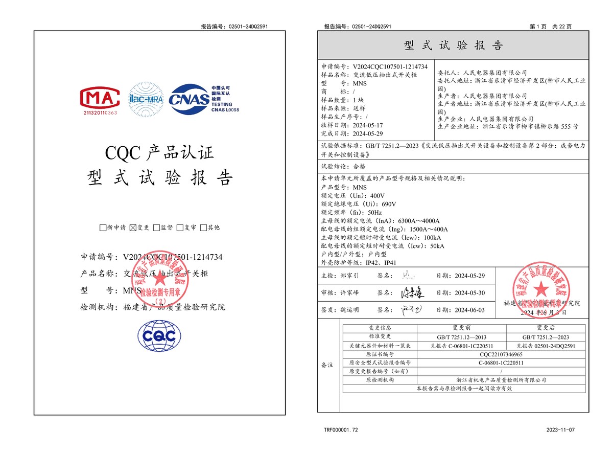 CQC試驗(yàn)報(bào)告 (202405):MNS 6300A-4000A交流低壓抽出式開關(guān)柜(點(diǎn)擊下載)