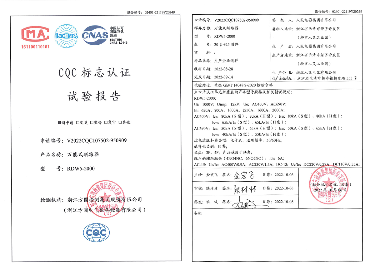 CQC試驗(yàn)報(bào)告(202210):RDW5-2000萬(wàn)能式斷路器(點(diǎn)擊下載)