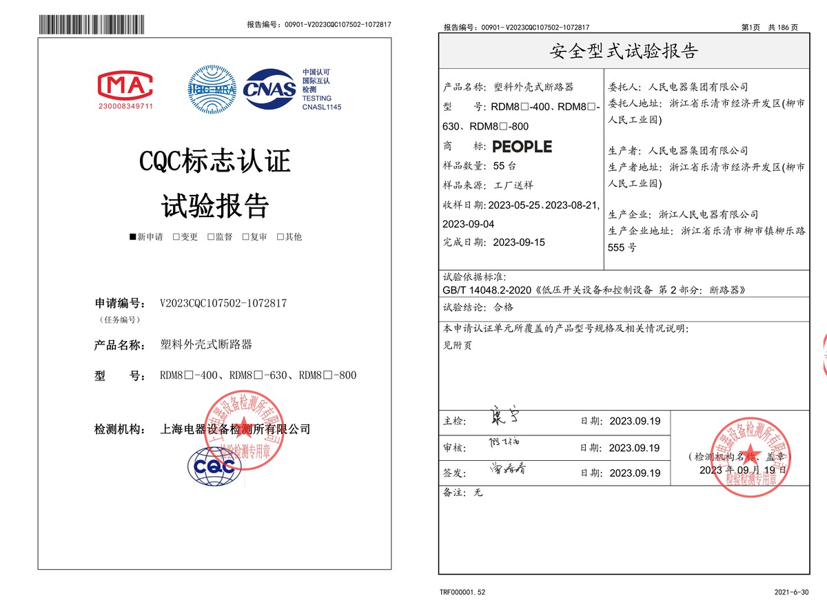 CQC試驗(yàn)報(bào)告(202309):RDM8□-400,RDM8□-630,RDM8□-800塑料外殼式斷路器(點(diǎn)擊下載)
