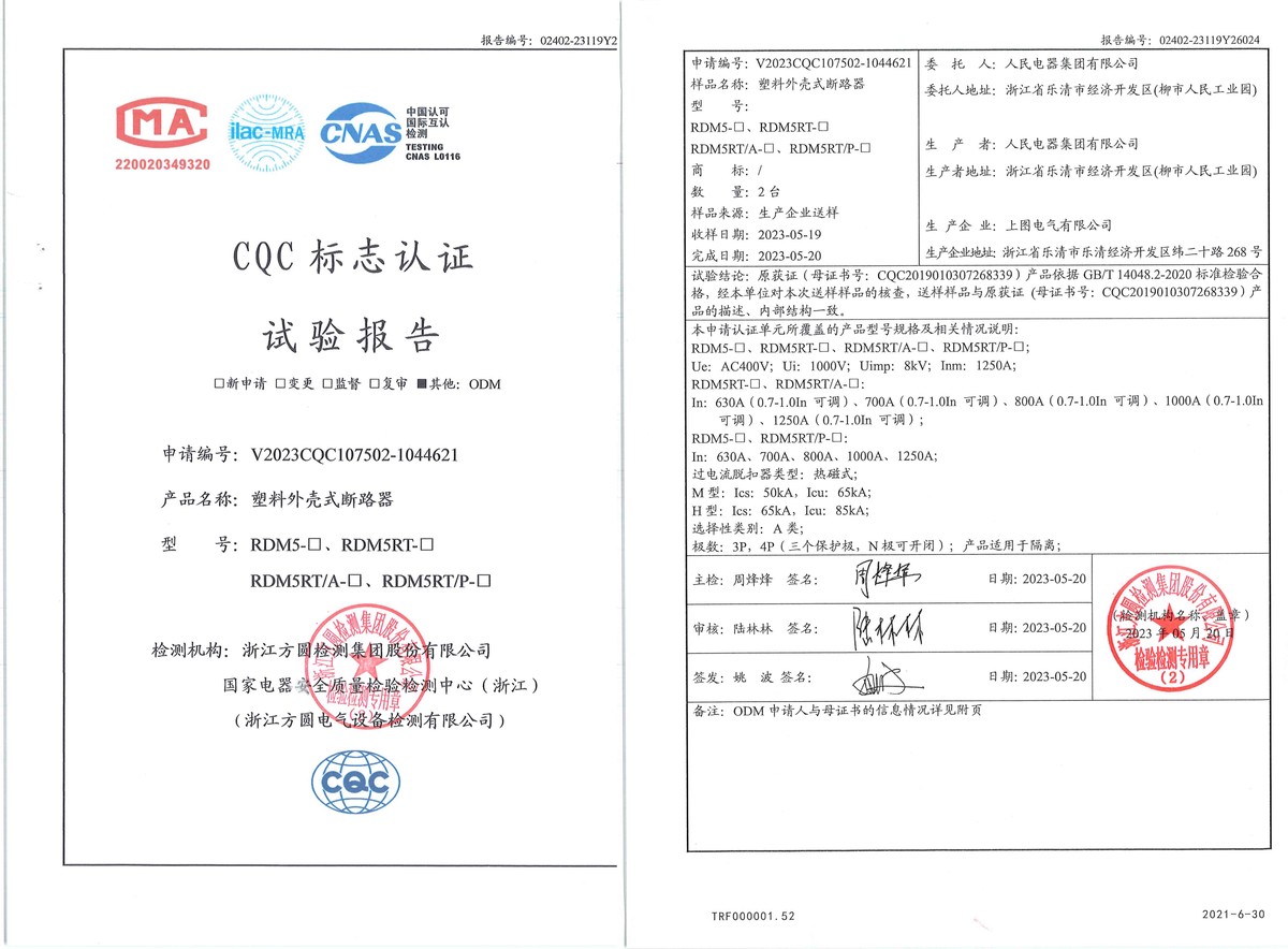 CQC試驗(yàn)報(bào)告(202305):RDM5-□,RDM5RT-□,RDM5RT/A-□,RDM5RT/P-□ 630~1250A塑料外殼式斷路器(點(diǎn)擊下載)