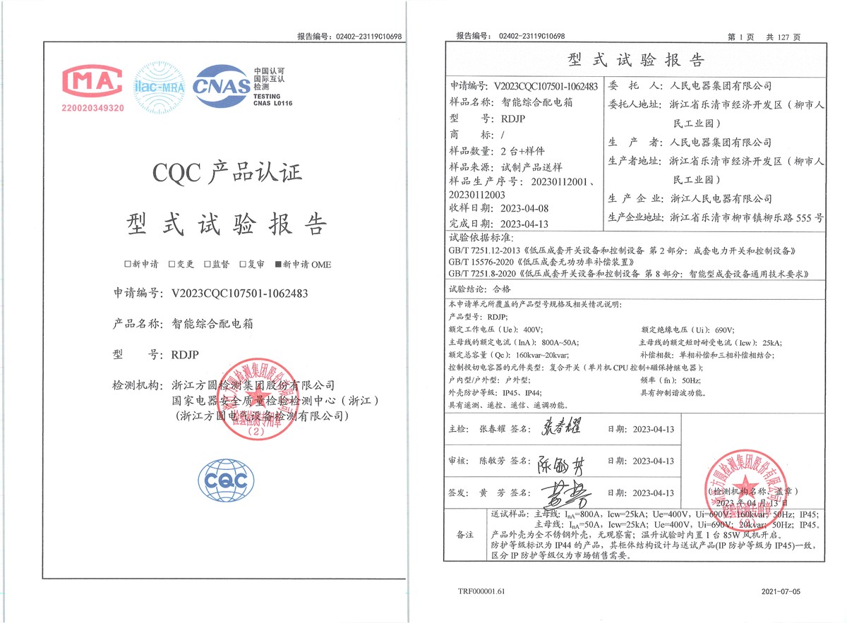 CQC試驗報告(202304):RDJP 800A~50A智能綜合配電箱(點擊下載)