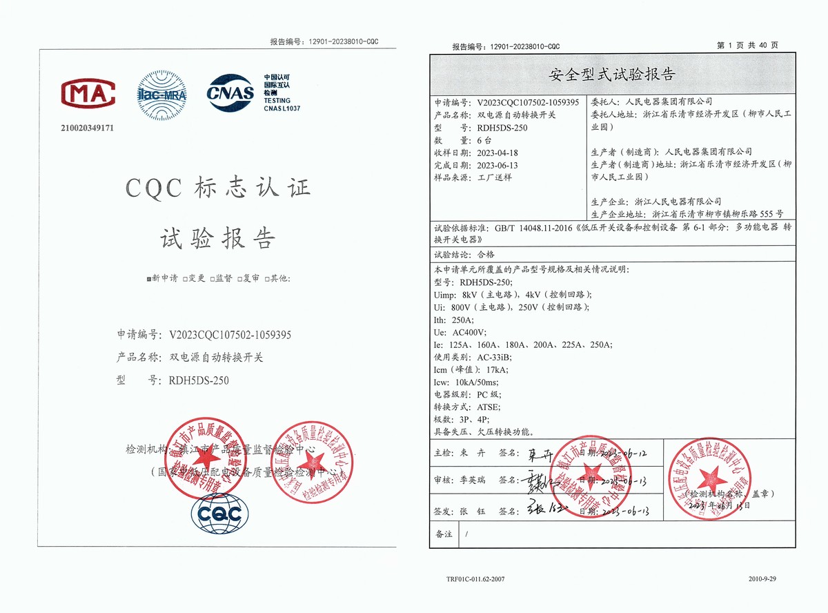 CQC試驗報告(202306):RDH5DS-250雙電源自動轉換開關(點擊下載)