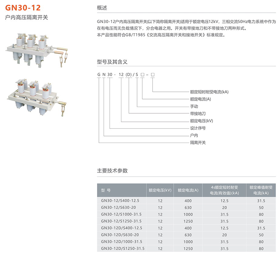 GN30-12系列戶內(nèi)高壓交流旋轉(zhuǎn)式隔離開關(guān)(以下簡稱隔離開關(guān))適用于額定電壓12kV,三相交流50Hz電力系統(tǒng)中作為在有電壓而無負(fù)載情況下,分合電器之用。開關(guān)有帶接地刀和不帶接地刀兩種形式。