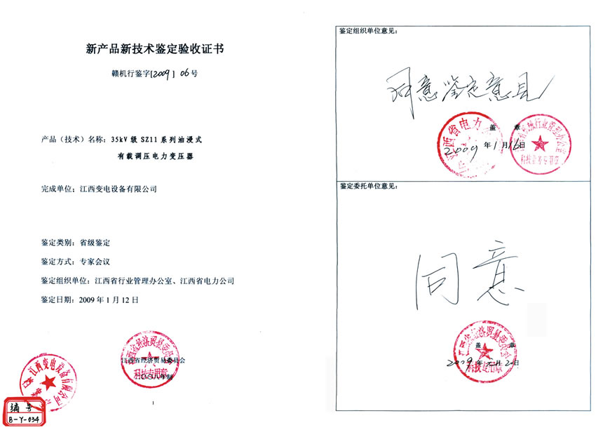 新產(chǎn)品新技術(shù)鑒定驗收證書:35KV級SZ11系列油浸式有載調(diào)壓電力變壓器(點擊下載)