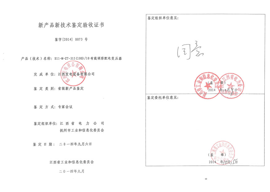 新產(chǎn)品新技術(shù)鑒定驗收證書:S11-M-ZT-315(100)/10有載調(diào)容配電變壓器(點擊下載)