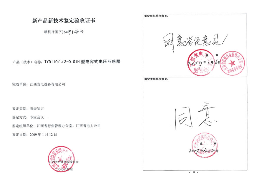 新產(chǎn)品新技術(shù)鑒定驗(yàn)收證書:TYD110/√3-0.01H型電容式電壓互感器(點(diǎn)擊下載)