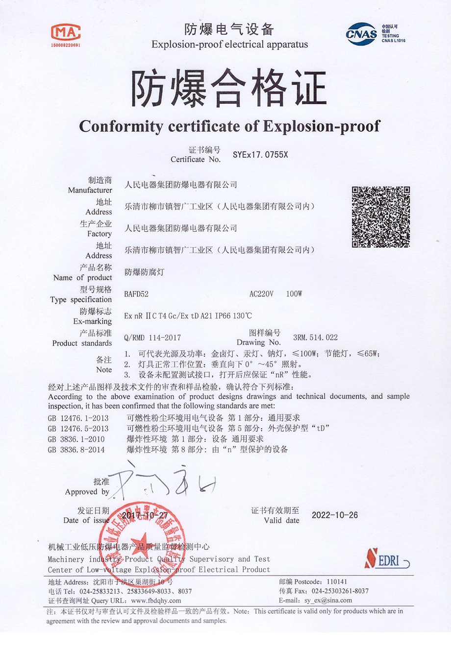 防爆合格證:BAFD52 AC220V 100W防爆防腐燈(點(diǎn)擊下載)