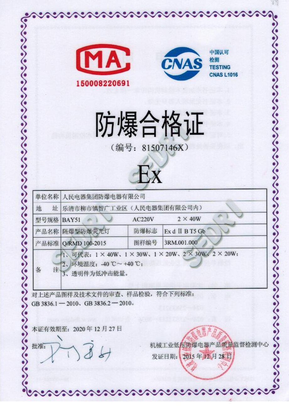 防爆合格證:BAY51 AC220V 2×40W隔爆型防爆熒光燈(點(diǎn)擊下載)