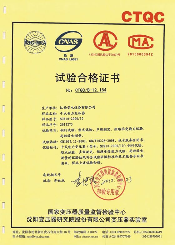 試驗(yàn)合格證書:SCR10-2000/10干式電力變壓器(點(diǎn)擊下載)