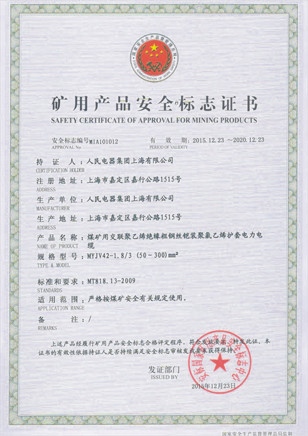 礦用產(chǎn)品安全標志證書:MYJV42-1.8/3(50~300)mm2煤礦用交聯(lián)聚乙烯絕緣粗鋼絲鎧裝聚氯乙烯護套電力電纜(點擊下載)