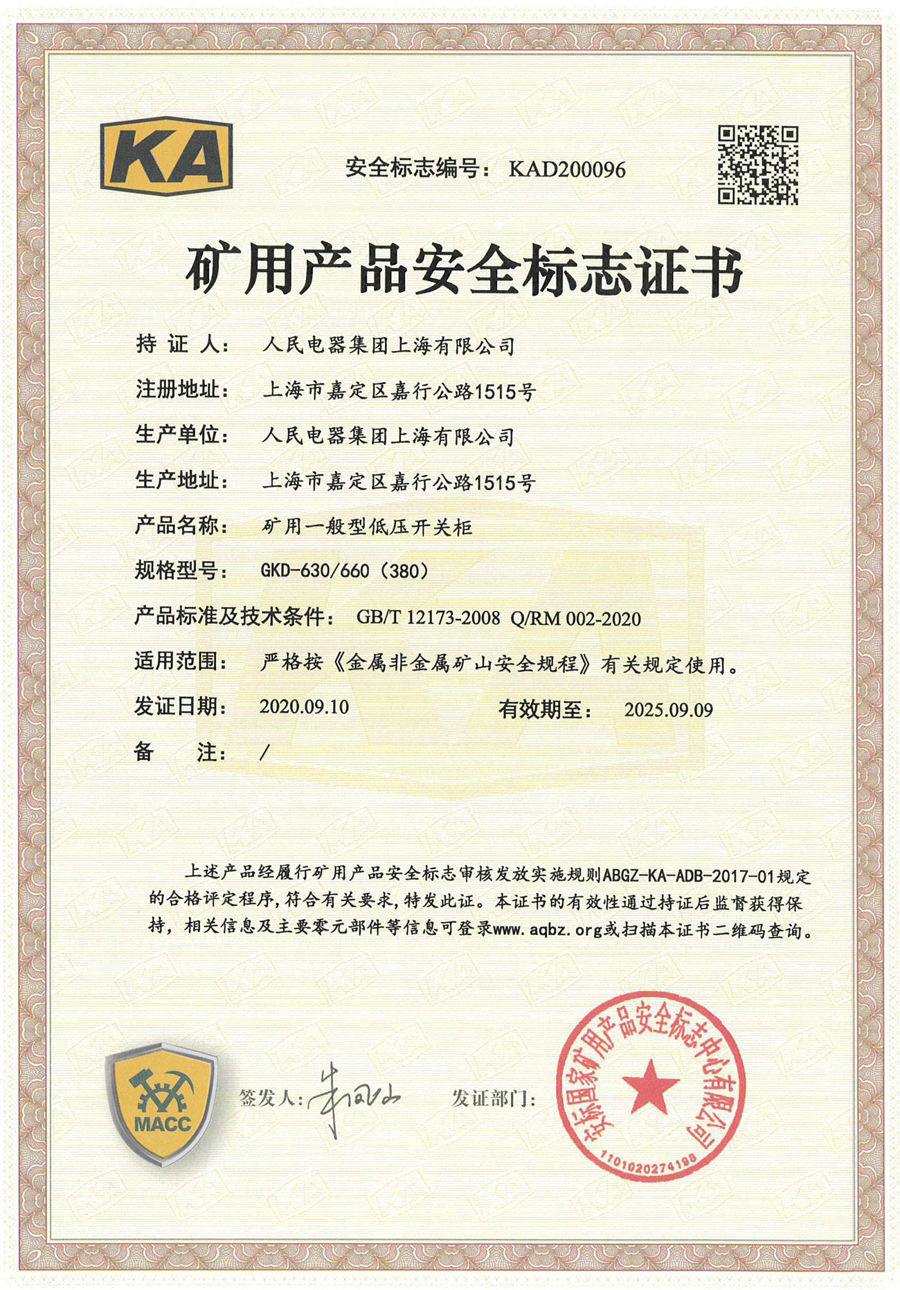 礦用產(chǎn)品安全標(biāo)志證書:礦用一般型低壓開關(guān)柜GKD-630/660(380)(點擊下載)