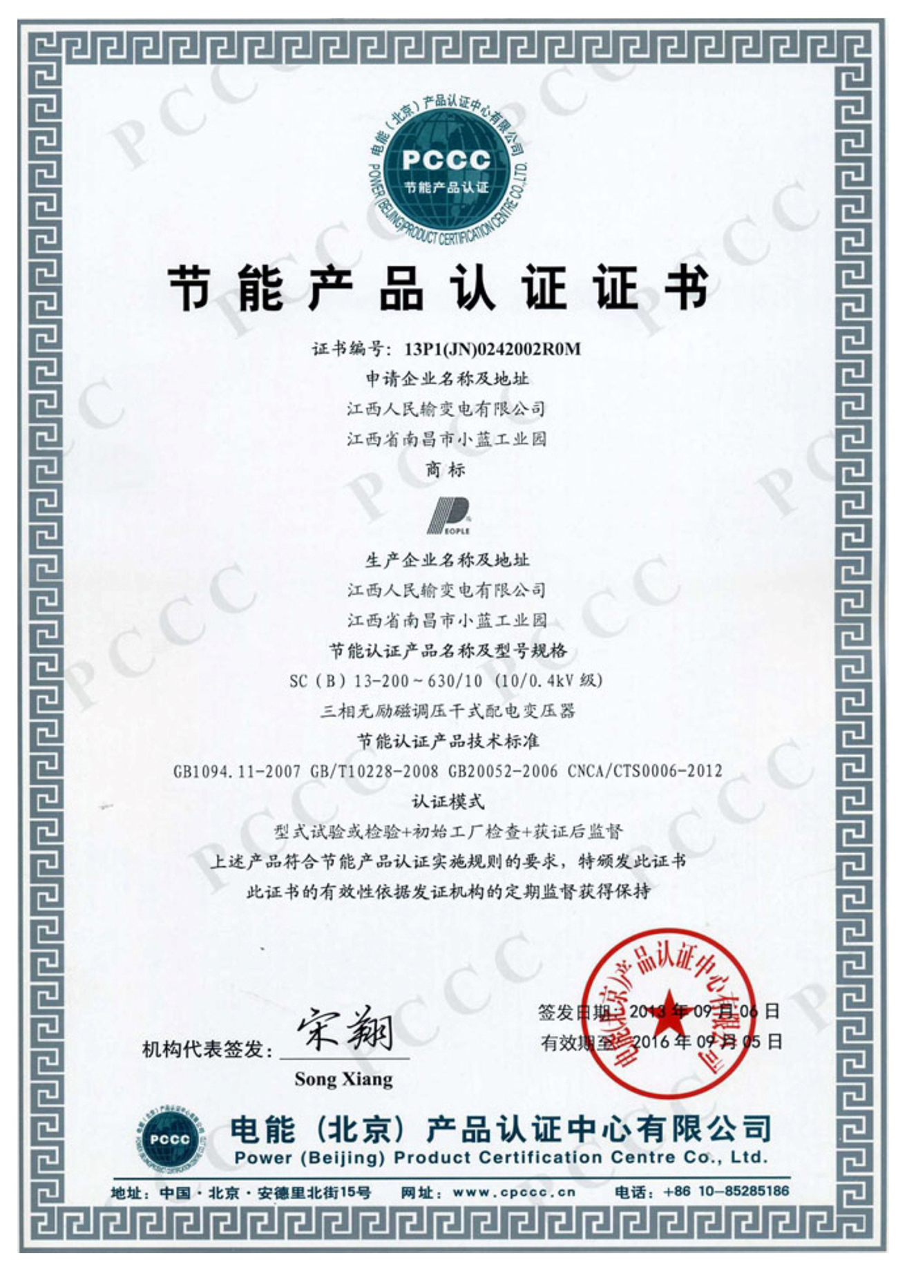 節(jié)能產(chǎn)品認證證書:SC(B)13-200~630/10(10/0.4kV級)三相無勵磁調(diào)壓干式配電變壓器(點擊下載)
