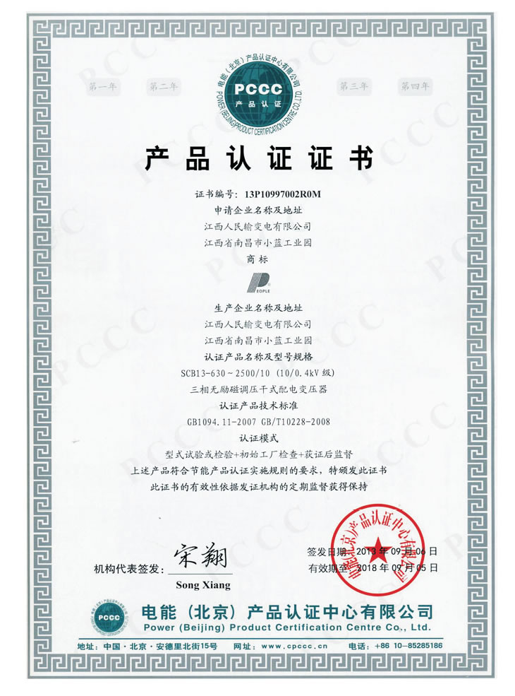 節(jié)能產(chǎn)品認(rèn)證證書:SC(B)13-630~2500/10(10/0.4kV級(jí))三相無(wú)勵(lì)磁調(diào)壓干式配電變壓器(點(diǎn)擊下載)