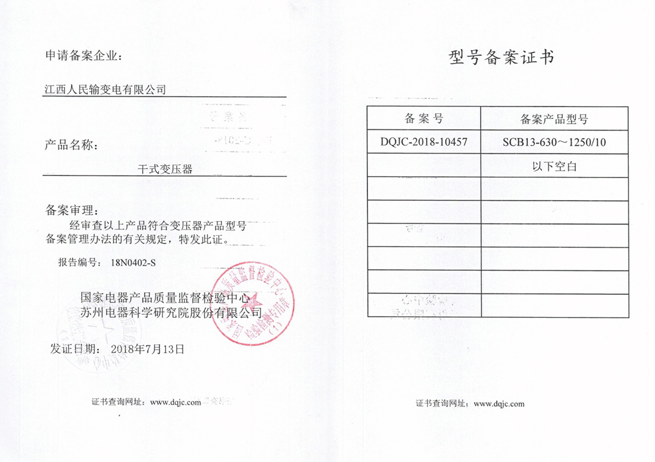 型號備案證書:SCB13-630~1250/10干式變壓器(點擊下載)