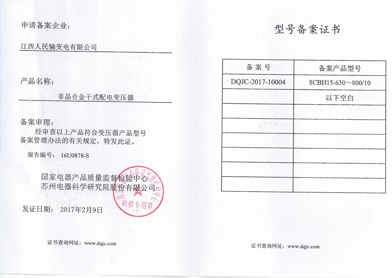 型號(hào)備案證書(shū):SCBH15-630~800/10 非晶合金干式配電變壓器(點(diǎn)擊下載)