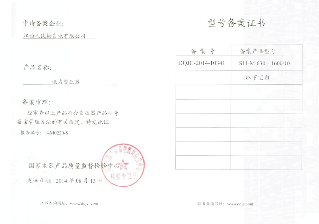 型號備案證書:S11-M-630-1600/10電力變壓器(點擊下載)
