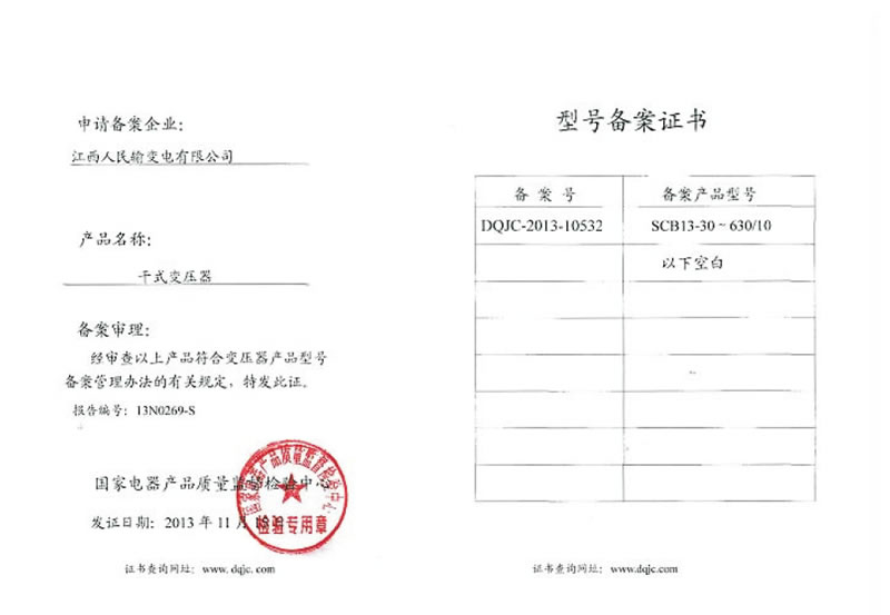 型號(hào)備案證書(shū):SCB13-30~630/10干式變壓器(點(diǎn)擊下載)