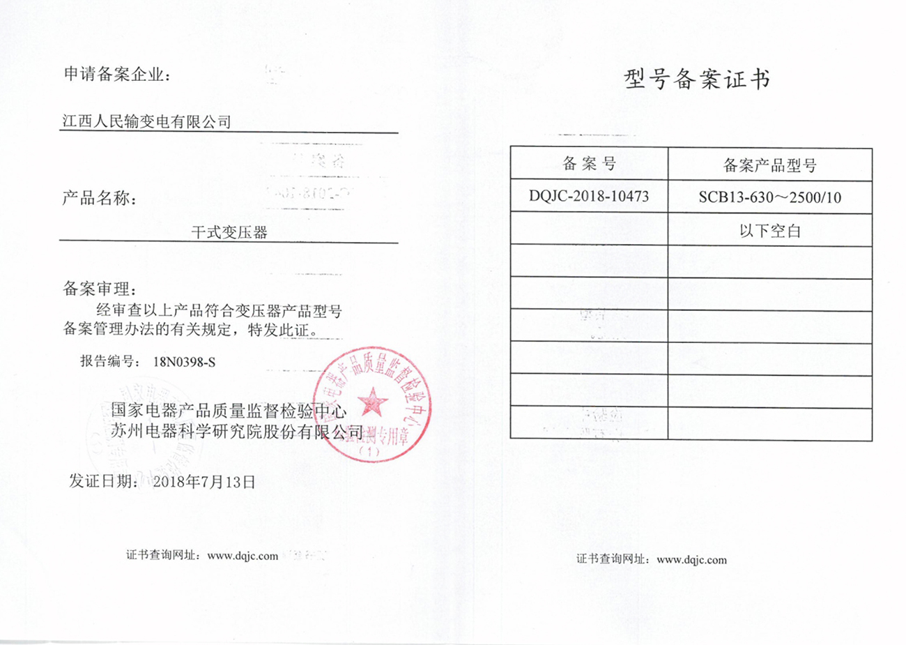 型號備案證書:SCB13-630~2500/10干式變壓器(點擊下載)