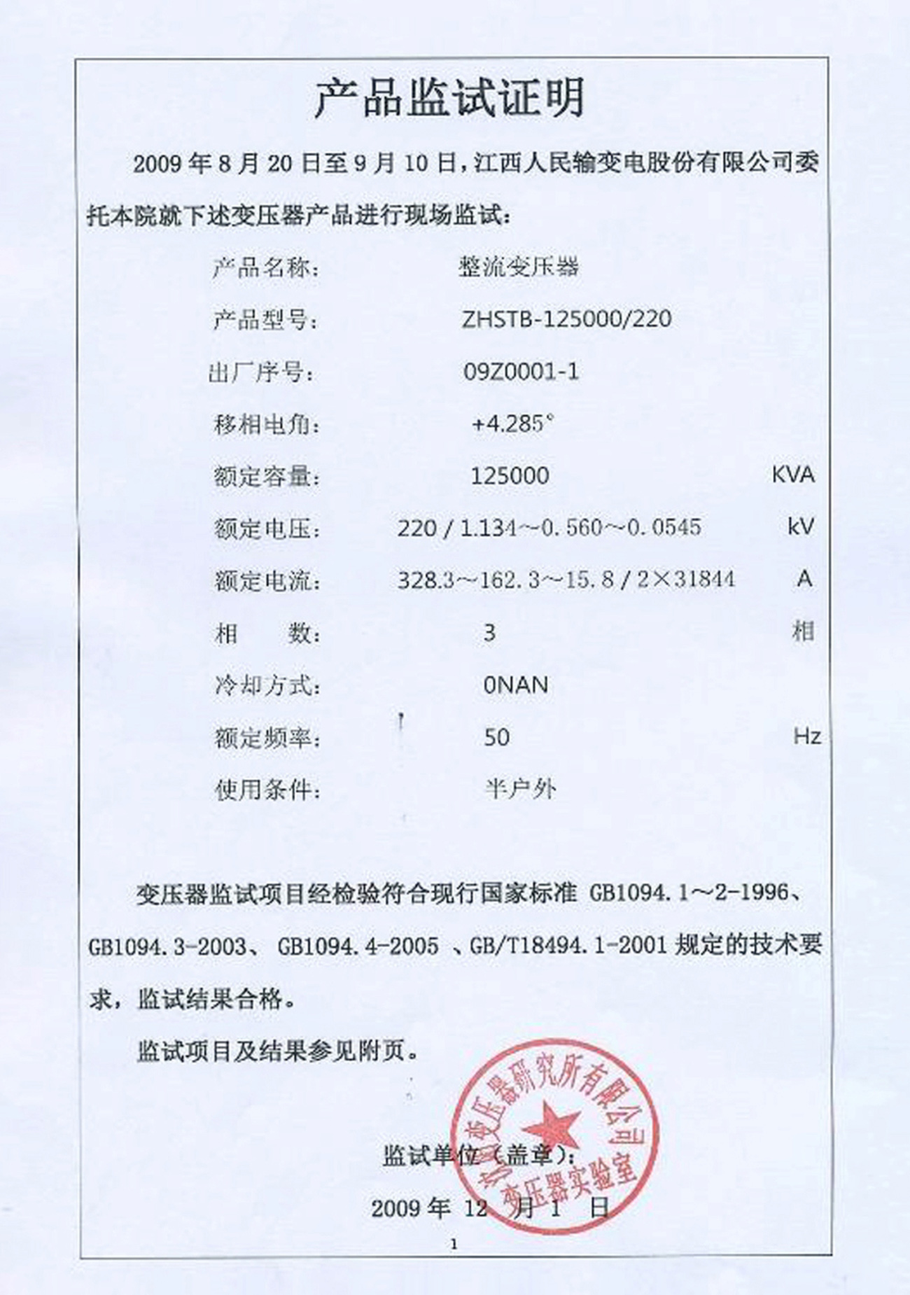 產(chǎn)品監(jiān)試證明:ZHSTB-125000/220 整流變壓器(點擊下載)