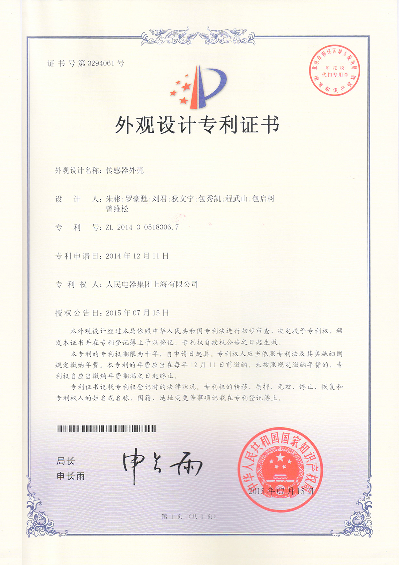 外觀設(shè)計(jì)專利證書:傳感器外殼(點(diǎn)擊下載)