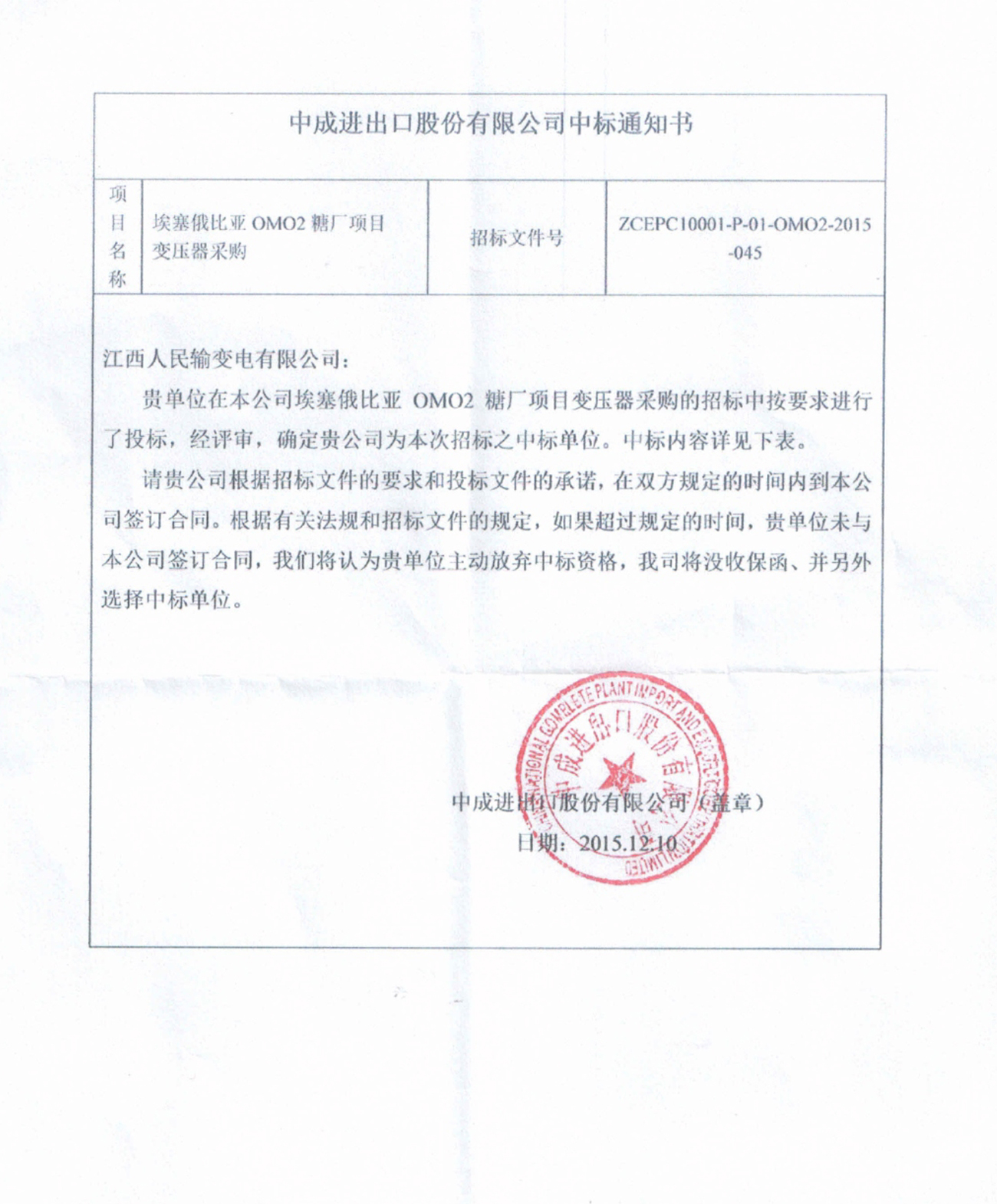 中標通知書:中成進出口股份有限公司(埃塞俄比亞OMO2糖廠項目)(點擊下載)