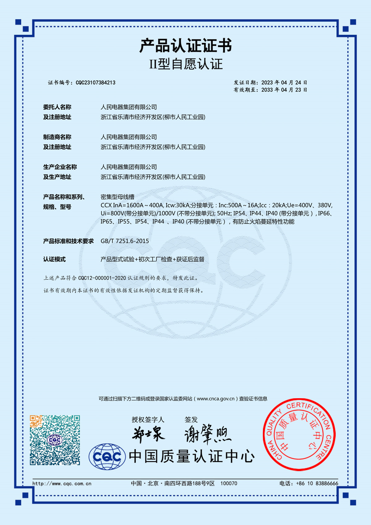 CQC認證證書:CCX InA=1600A~400A密集型母線槽(證書編號:CQC23107384213)(點擊下載)