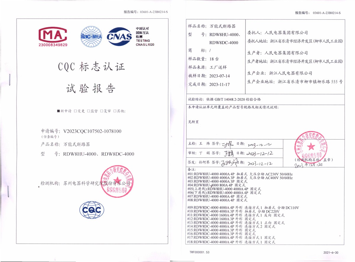 CQC試驗(yàn)報(bào)告(202312):RDW8HU-4000,RDW8DC-4000萬能式斷路器(點(diǎn)擊下載)