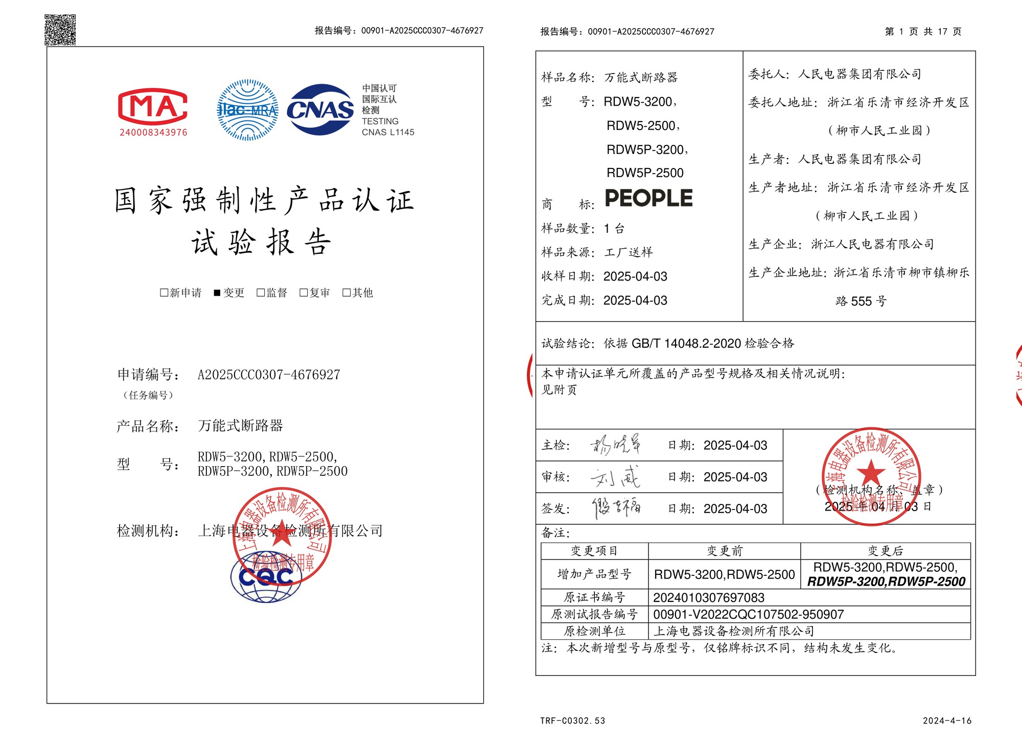CCC試驗報告(202504):RDW5-3200,RDW5-2500,RDW5P-3200,RDW5P-2500萬能式斷路器(點擊下載)