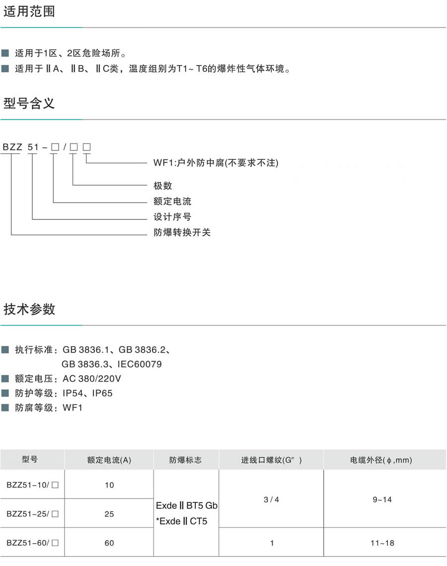 適用于1區(qū)、2區(qū)危險(xiǎn)場所。 適用于ⅡA、ⅡB、ⅡC類,溫度組別為T1~T6的爆炸性氣體環(huán)境。