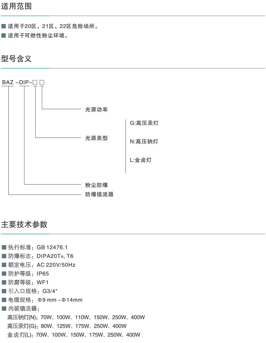 > BAZ-DIP系列粉塵防爆鎮(zhèn)流器(DIPA)