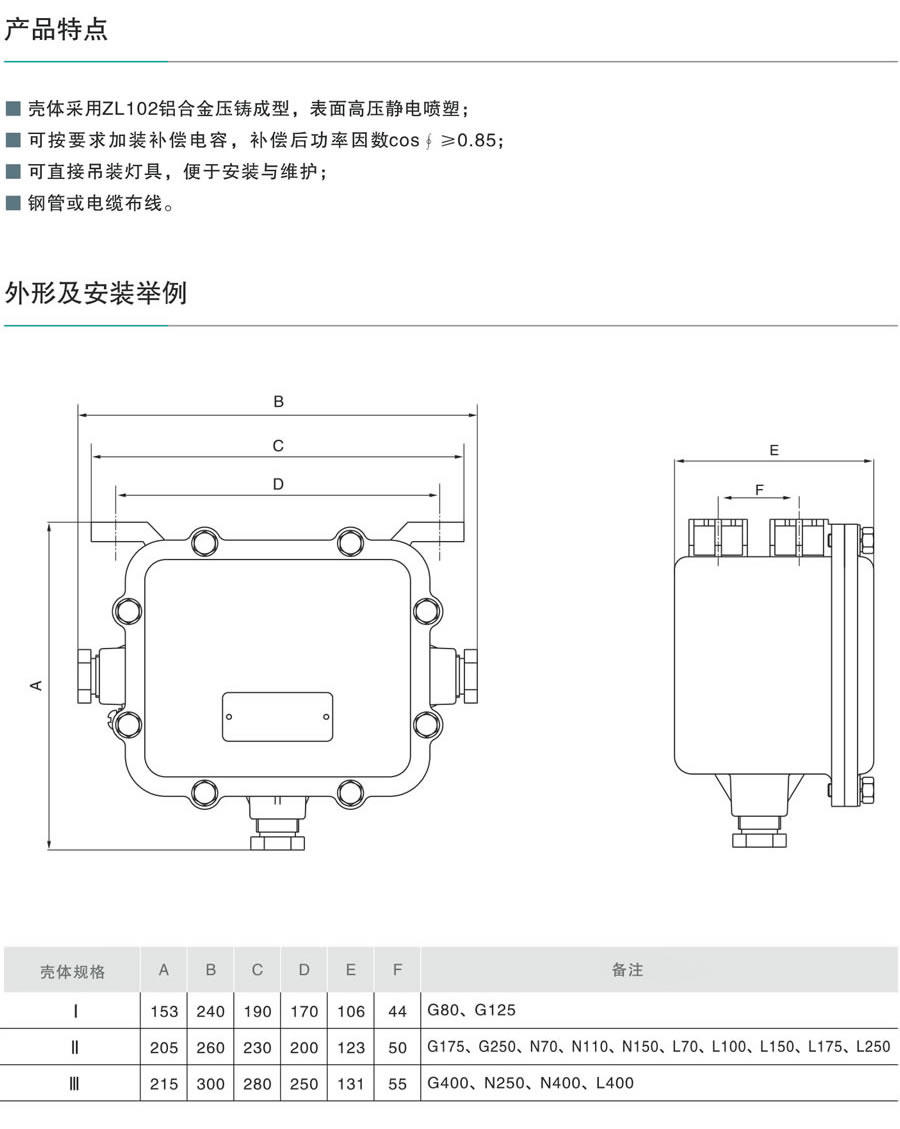 殼體采用ZL102鋁合金壓鑄成型,表面高壓靜電噴塑;可按要求加裝補(bǔ)償電容,補(bǔ)償后功率因數(shù)cos≥0.85;可直接吊裝燈具,便于安裝與維護(hù)鋼管或電纜布線(xiàn)。