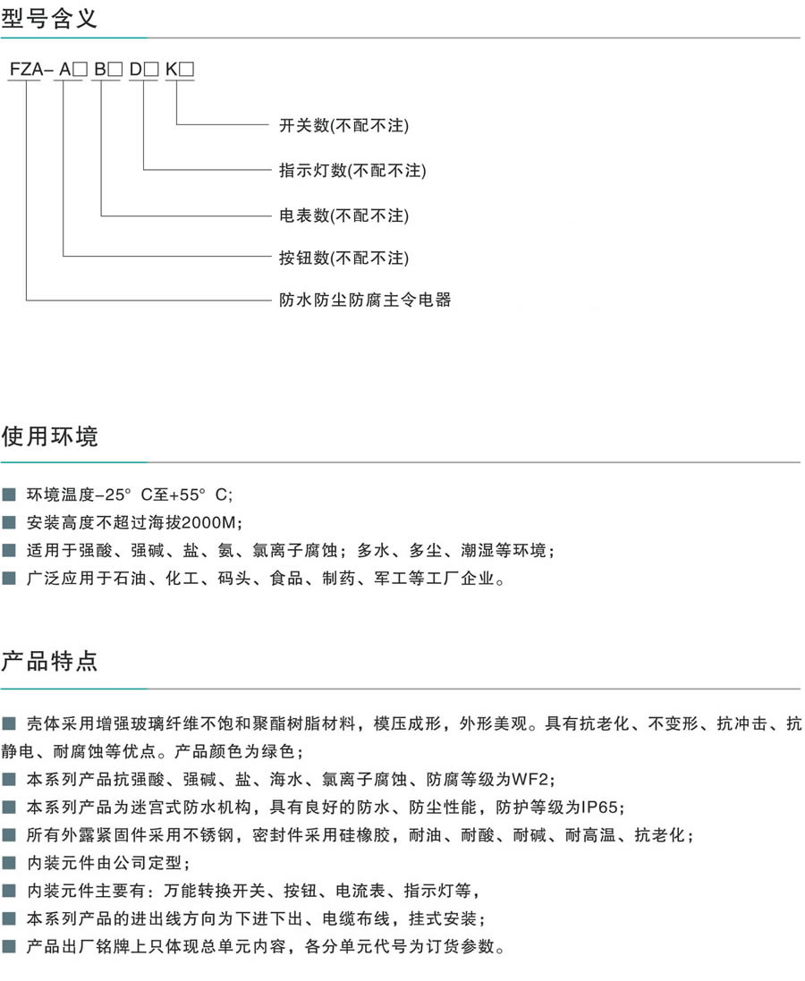 本系列產(chǎn)品抗強酸、強堿、鹽、海水、氯離子腐蝕、防腐等級為WF2本系列產(chǎn)品為迷宮式防水機構(gòu),具有良好的防水、防塵性能,防護等級為IP65;所有外露緊固件采用不銹鋼,密封件采用硅橡膠,耐油、耐酸、耐堿、耐高溫、抗老化;