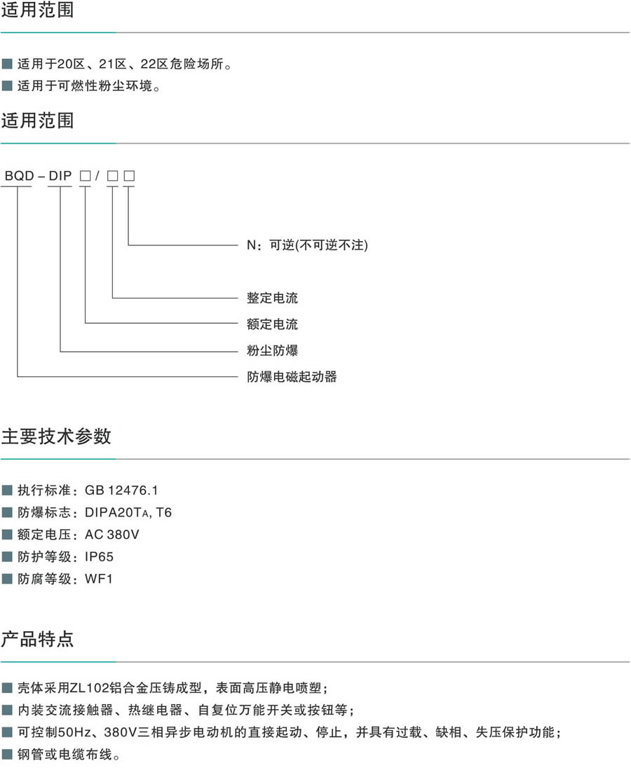 殼體采用ZL102鋁合金壓鑄成型,表面高壓靜電噴塑;內(nèi)裝交流接觸器、熱繼電器、自復(fù)位萬能開關(guān)或按鈕等;可控制50Hz、380V三相異步電動機(jī)的直接起動、停止,并具有過載、缺相、失壓保護(hù)功能;鋼管或電纜布線。