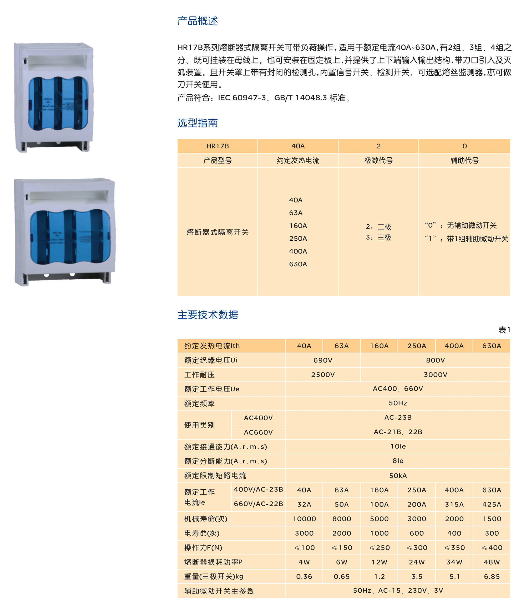 HR17B系列熔斷器式隔離開(kāi)關(guān)可帶負(fù)荷操作,適用于額定電流40A~630A,有2組、3組、4組之