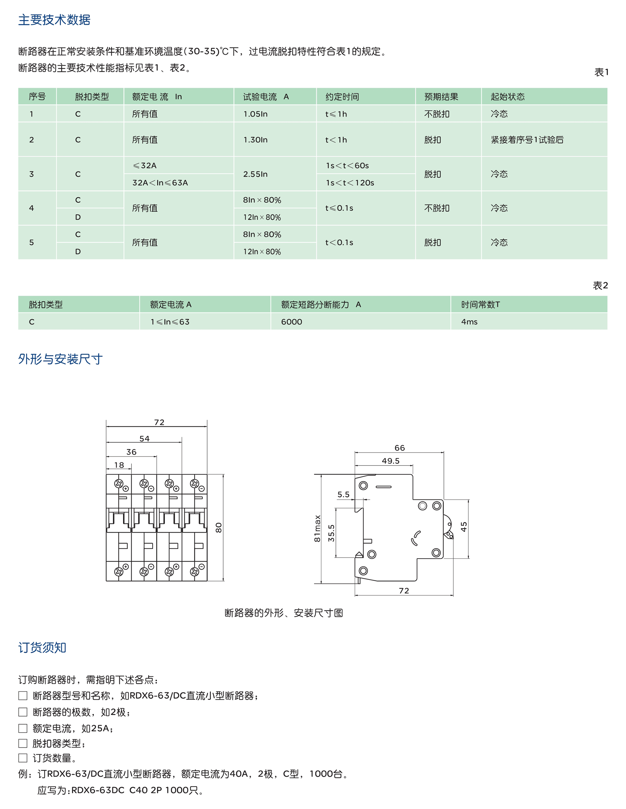 RDX6-63/DC直流小型斷路器,主要用于直流電路,額定工作電壓至1000V,額定電流至63A,額定運(yùn)行短路分?jǐn)嗄芰Σ怀^6KA的保護(hù)配電線路中,作為線路不頻繁接通、分?jǐn)嗪娃D(zhuǎn)換之用,具有過載、 短路保護(hù)功能。同時(shí)具有強(qiáng)大的輔助功能模塊,如輔助觸點(diǎn)、帶報(bào)警指示觸點(diǎn)、分勵(lì)脫扣器、欠壓脫扣器、遠(yuǎn)程脫扣控制等模塊。