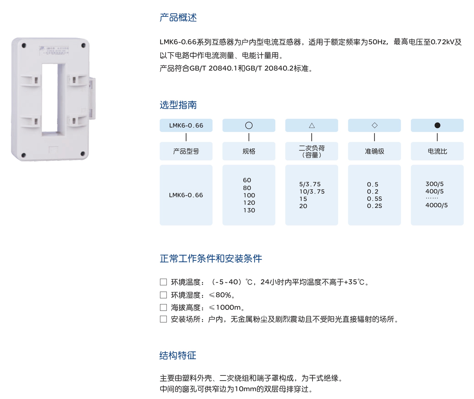 LMK6-0.66系列互感器為戶內(nèi)型電流互感器,適用于額定頻率為50Hz,最高電壓至0.72kV及以下電路中作電流測量、電能計量用。 產(chǎn)品符合GB/T 20840.1和GB/T 20840.2標(biāo)準(zhǔn)。