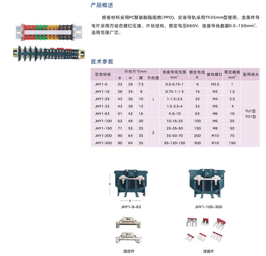 絕緣材料采用PC聚碳酸酯阻燃(PPO),安裝導軌采用Th35mm型使用,金屬件導電片采用方組合螺釘壓接,片狀結構,額定電壓660V,連接導線截面0.5~150mm2 , 適用范圍廣泛。