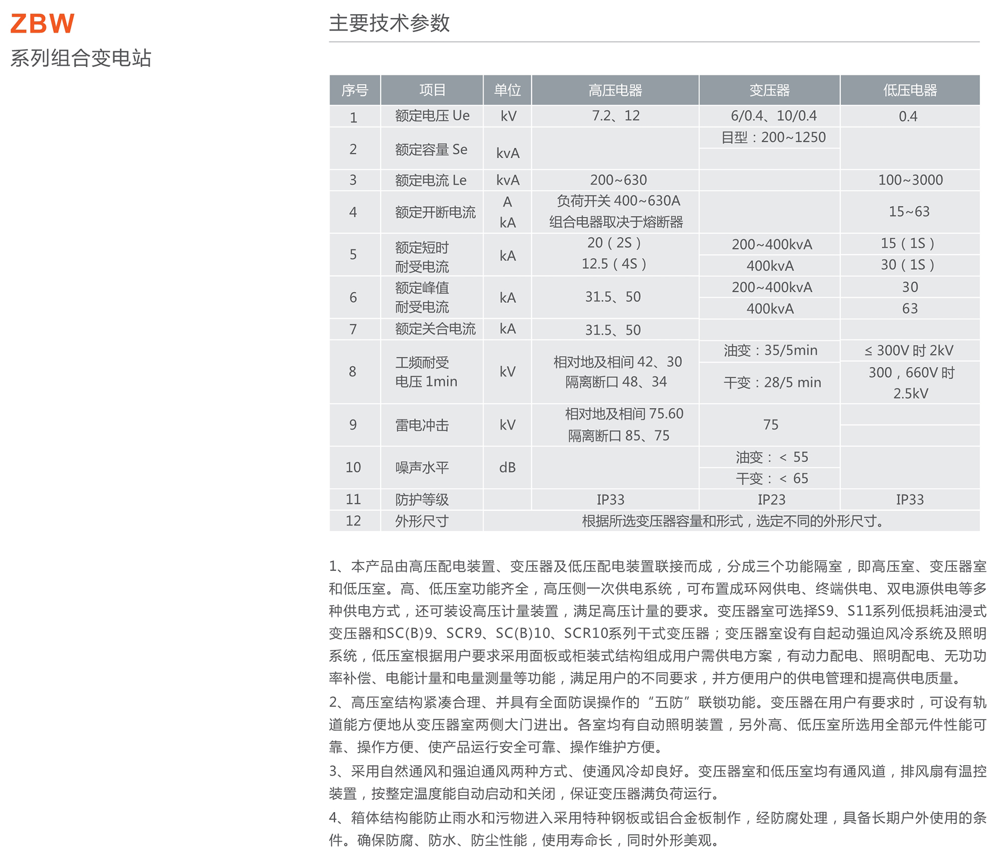 ZBW系列組合式變電站,俗稱歐式箱變,是將高壓電器設(shè)備、變壓器、低壓電器設(shè)備等組合成緊湊型成套配電裝置,用于城市高層建筑、城鄉(xiāng)建筑、居民小區(qū)、高新技術(shù)開發(fā)區(qū)、中小型工廠、礦山油田以及臨時施工用電等場所,作配電系統(tǒng)中接受和分配電能之用。