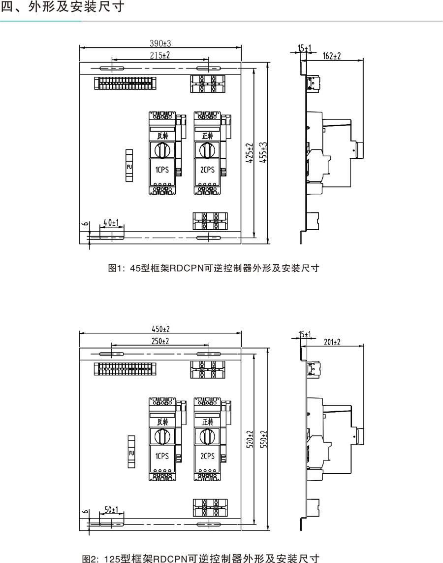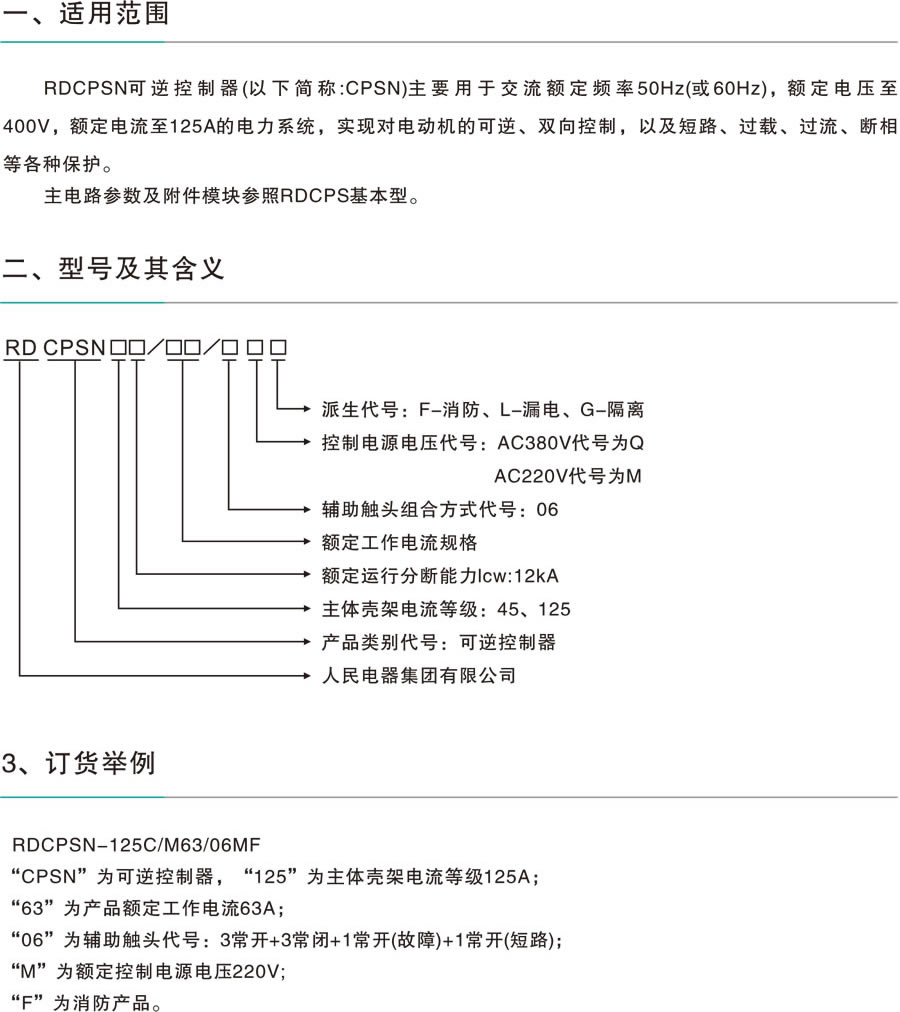 RDCPSN可逆控制器(以下簡稱:CPSN)主要用于交流額定頻率50Hz(或60Hz)至額定電壓400V,額定電流至125A的電力系統(tǒng),實(shí)現(xiàn)對(duì)電動(dòng)機(jī)的可逆、雙向控制,以及短路、過報(bào)過流、斷等各種保護(hù)。