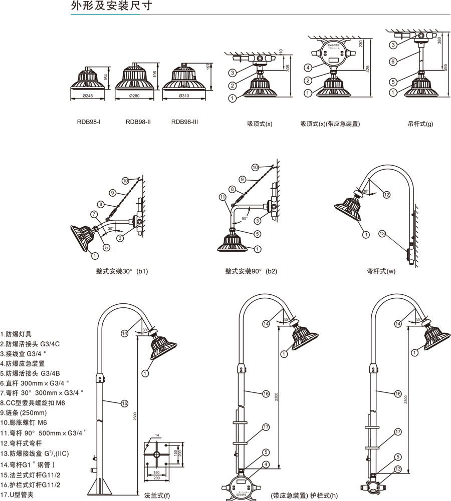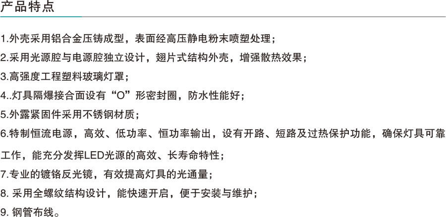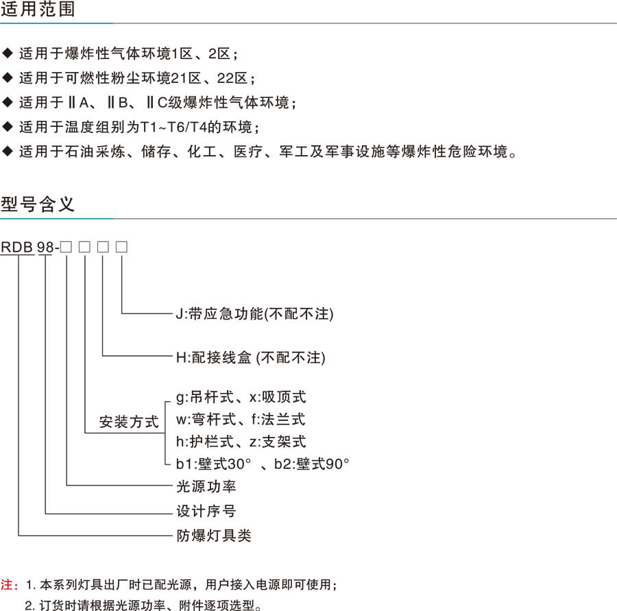 適用于ⅡA、ⅡB、ⅡC類含有爆炸性氣體環(huán)境,溫度組別為T1-T6/T4的1區(qū)、2區(qū)室內(nèi)外危險場氣或21區(qū)、22區(qū)爆炸性或可燃性粉塵場所室內(nèi)外照明。