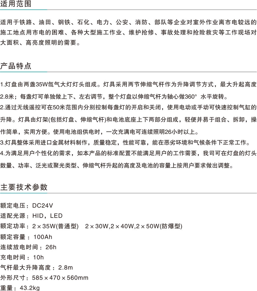 適用于鐵路、油田、鋼鐵、石化、電力、公安、消防、部隊等企業(yè)對室外作業(yè)離市電較遠的施工地點用市電的困難、各種大型施工作業(yè)、維護搶修、事故處理和搶險救災等工作現(xiàn)場對大面積、高亮度照明的需要。
