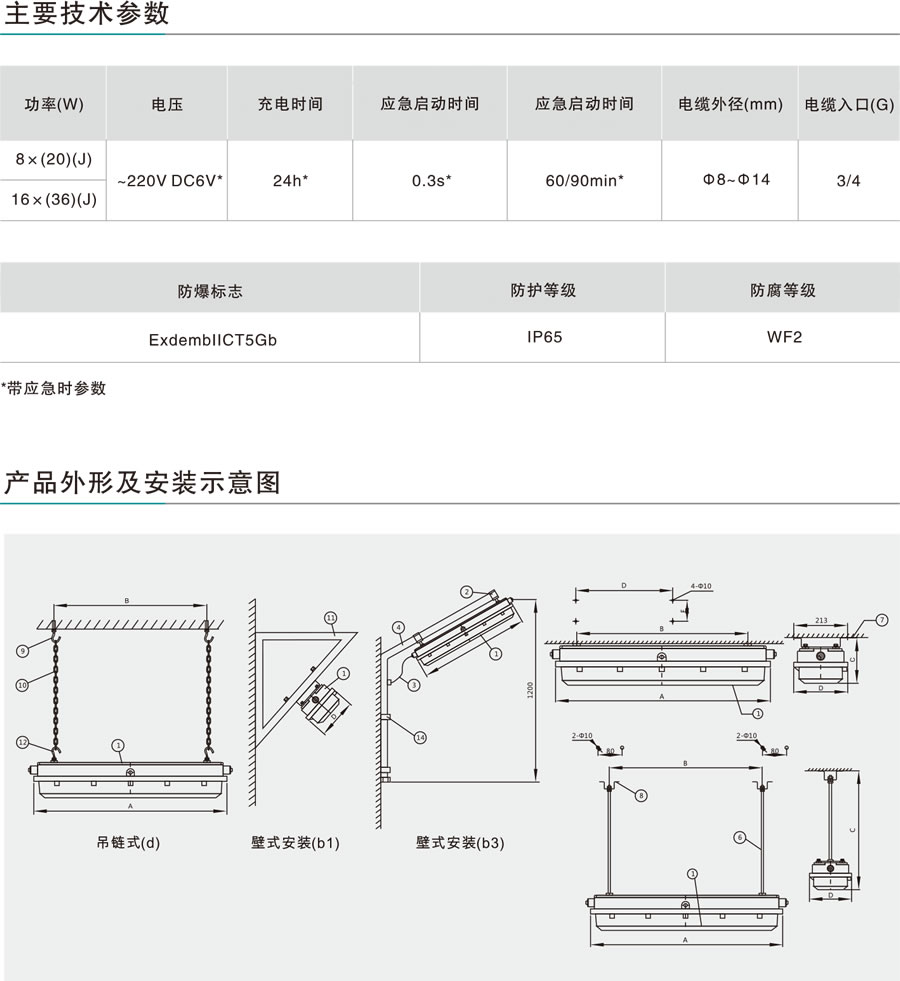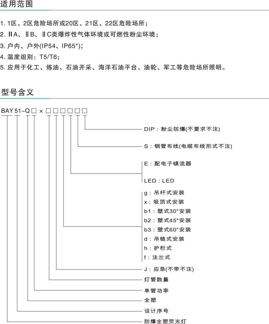 1.1區(qū)、2區(qū)危險場所或20區(qū)、21區(qū)、22區(qū)危險場所; 2.ⅡA、ⅡB、ⅡC類爆炸性氣體環(huán)境或可燃性粉塵環(huán)境; 3.戶內(nèi)、戶外(IP54、I|P65) 4.溫度組別:T5/T6; 5.應(yīng)用于化工、煉油、石油開采、海洋石油平臺、油輪、軍工等危險場所照明。