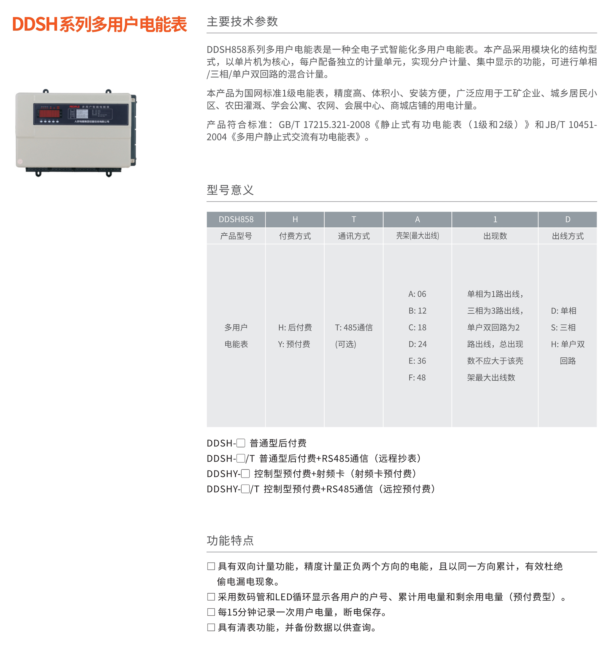 DDSH858系列多用戶電能表是一種全電子式智能化多用戶電能表。本產(chǎn)品采用模塊化的結構型式,以單片機為核心,每戶配備獨立的計量單元,實現(xiàn)分戶計量、集中顯示的功能,可進行單相/三相/單戶雙回路的混合計量。