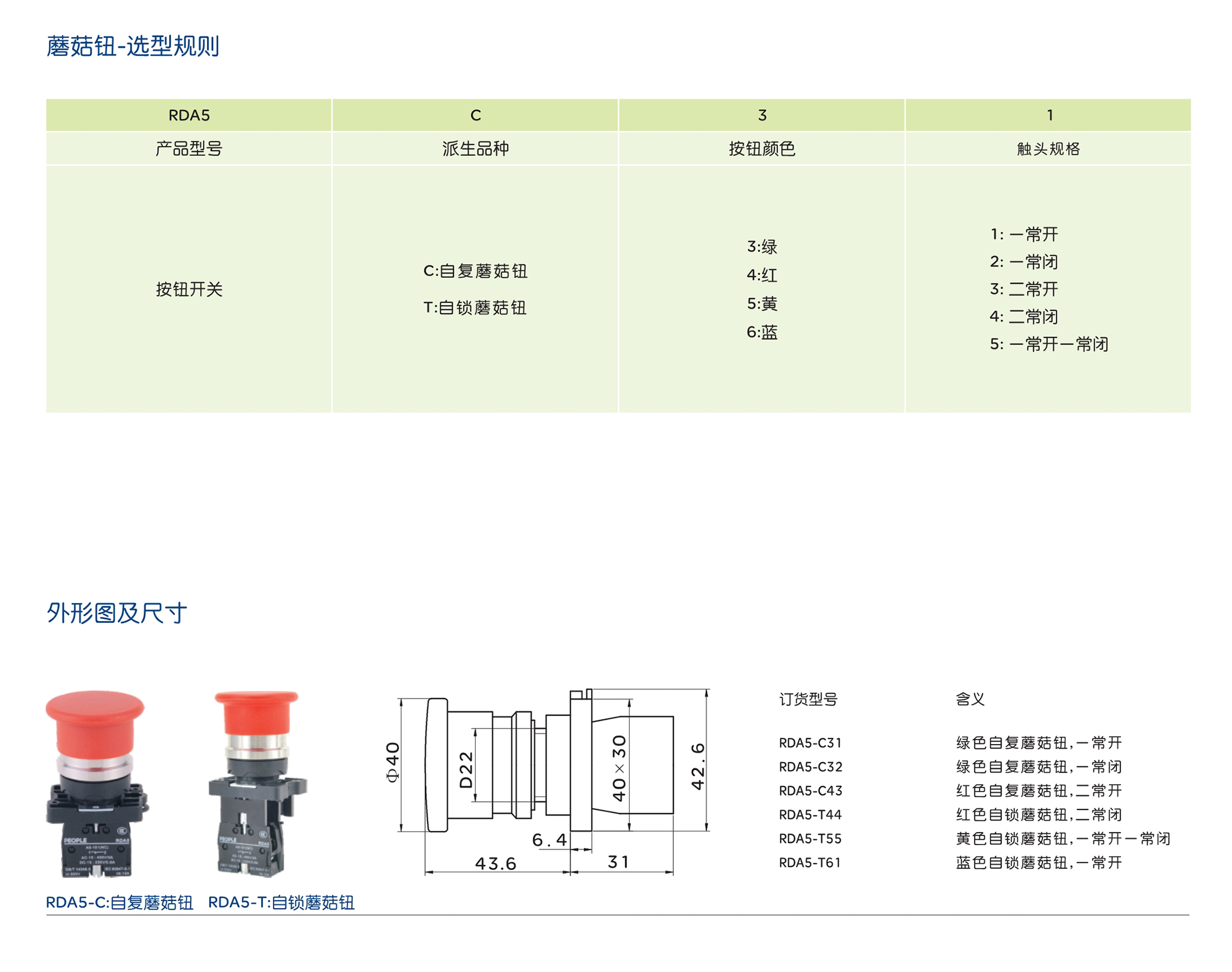 RDA5按鈕開關(guān)(以下簡稱按鈕)適用于5060Hz、額定工作電壓至400V及直流工作電壓至230V的工業(yè)控制電路中,作為電磁起動(dòng)器、接觸器、繼電器及其它電氣線路的控制之用。